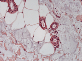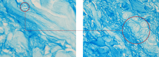 Spoločné histologické škvrny ukazujú výplň (svetlo modrá) dokonale integrovanou do spojivového tkanív s kolagénnymi vláknami, tukovými tkanivami a kanáliky potných žliaz. Neexistujú žiadne imunoreakce.